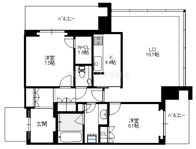 間取り 2LDK(洋7.5 洋6.1 LD16.1 K4.4)