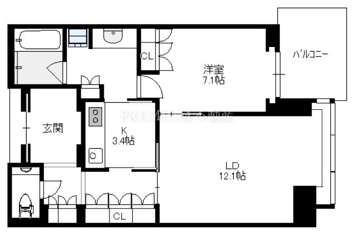 間取り 1LDK(洋7.1 LD12.1 K3.4)