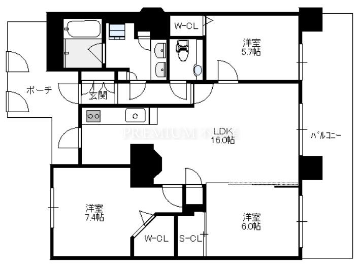 間取り 3LDK(洋7.4 洋6.0 洋5.7 LDK16.0)
