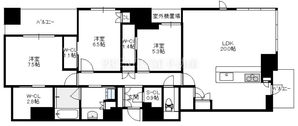 間取り 3SLDK(洋7.5 洋6.5 洋5.3 S0.9 LDK20.0)