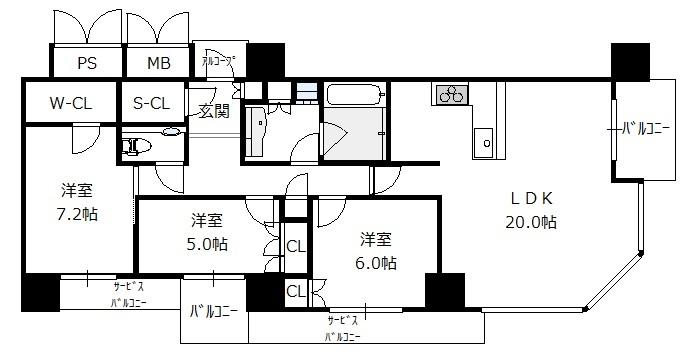 間取り 3LDK(洋7.2 洋6.0 洋5.0 LDK20.0)