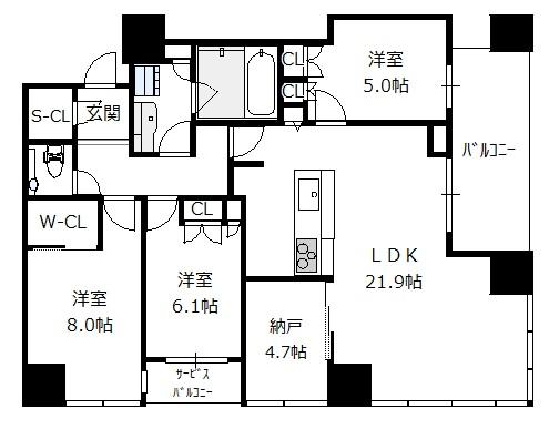 間取り 3SLDK(洋8.0 洋6.1 洋5.0 S4.7 LDK21.9)