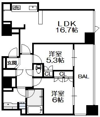 間取り 2SLDK(洋6.0 洋5.3 S0.6 LDK16.7)