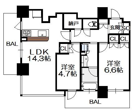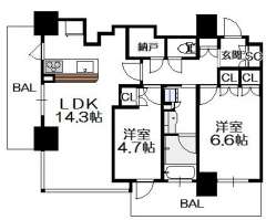 間取り 2SLDK(洋6.6 洋4.7 S1.2 LDK14.3)