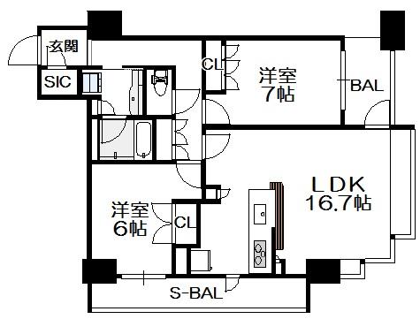 間取り 2LDK(洋7.0 洋6.0 LDK16.7)