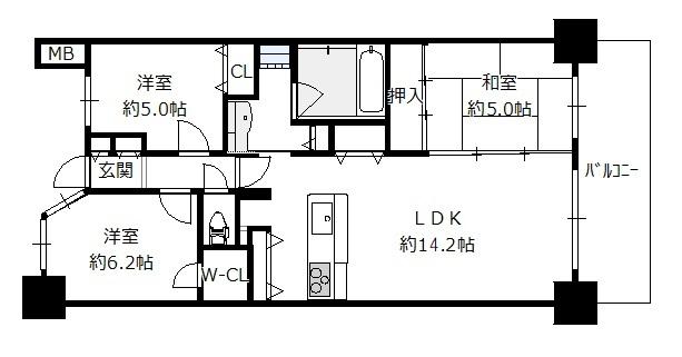 間取り 3LDK(洋6.2 洋5.0 和5.0 LDK14.2)