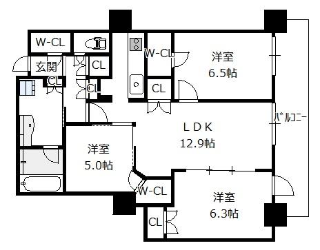 間取り 3LDK(洋6.5 洋6.3 洋5.0 LDK12.8)