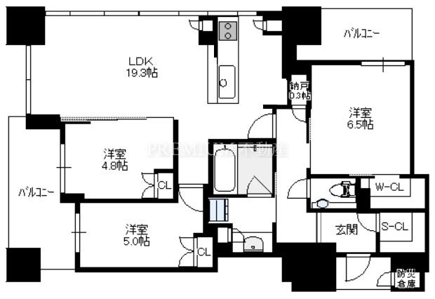 間取り 3SLDK(洋6.5 洋5.0 洋4.8 S0.3 LDK19.3)