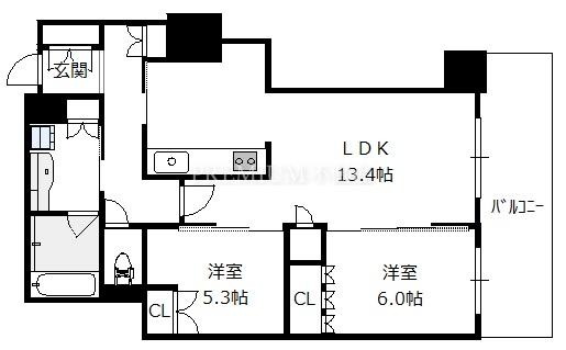 Layout: 2LDK(洋6.0 洋5.3 LDK13.4)