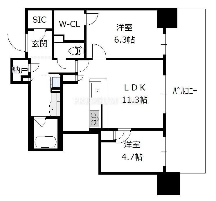 Layout: 2LDK(洋6.3 洋4.7 LDK11.3)