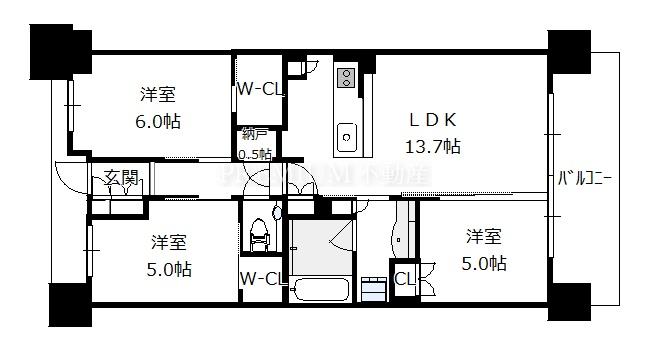 Layout: 3LDK(洋6.0 洋5.0 洋5.0 LDK13.7)