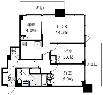Layout: 3LDK(洋6.0 洋5.0 洋4.0 LDK14.3)