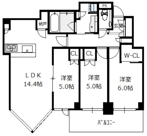 Layout: 3LDK(洋6.0 洋5.0 洋5.0 LDK14.4)