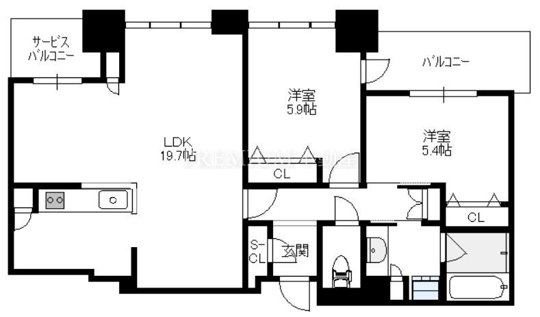 Layout: 2LDK(洋5.9 洋5.4 LDK19.7)