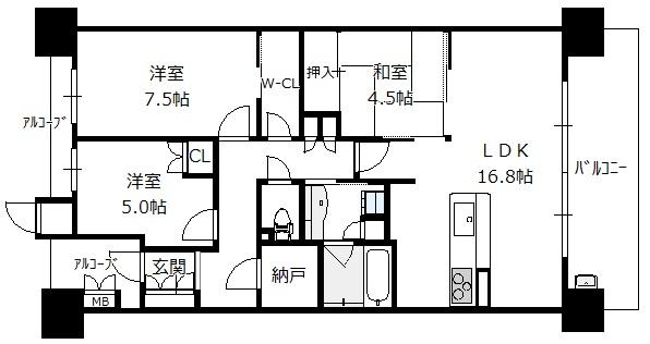 户型 3SLDK(洋7.5 洋5.0 和4.5 S1.3 LDK16.8)