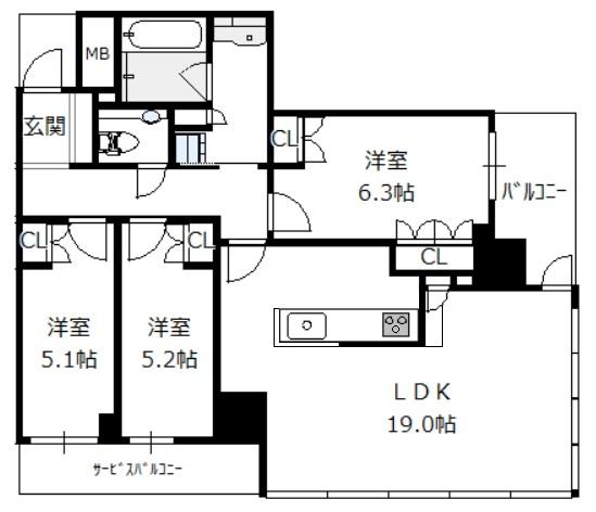户型 3LDK(洋6.3 洋5.2 洋5.1 LDK19.0)